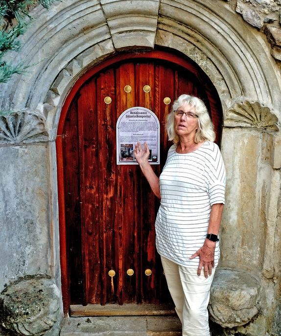Sabine Schneider während eines Ortsrundganges am Sitznischenportal.